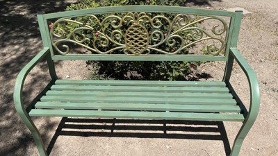 This outdoor green metal bench is an elegant and functional addition to any patio or garden. The seat has standard panel slats design. The seatback has a cut-out a scroll design and a gold pineapple in the center. 400 lbs. limit. Also: 8MB065