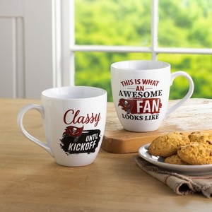 Measures approximately 5.87 x 4.75 inches. This Ceramic Cup O'Java is microwave and top rack dishwasher safe. Comes with a matching gift box. Enjoy a hot coffee or refreshing beverage with these mugs that holds up to 17 oz. Its circular-shaped handle helps you enjoy your morning coffee or hot tea comfortably while supporting your favorite NFL team. Features the official Tampa Bay Buccaneers logo and colors. These mugs have a sleek design and also include playful text to get you ready for gameday. Reads: "This is what an Awesome Fan Looks Like" and "Classy until Kickoff." Perfect gift for a friend or family member who is a fan of the Tampa Bay Buccaneers. Evergreen Sports offers nothing but officially licensed college and professional sports league products. We pride ourselves on unique and eye catching designs for every item. Our products make the perfect gift for any occasion for family and friends or yourself! Evergreen Sports features NFL, NHL, MLB & NCAA licensed products. We carry items for every fan sho