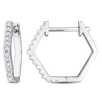 Add a touch of brilliance to your jewelry collection with these Everly Jewelry sterling silver hoop earrings, featuring 1/8 CT TGW of created white moissanite. Each stone is expertly cut to maximize sparkle, delivering a dazzling shimmer that rivals natural diamonds. The polished sterling silver setting provides both durability and timeless elegance. Designed for a comfortable and secure fit, these hoops are perfect for everyday wear or special occasions. Sleek, versatile, and eye-catching, these created white moissanite hoop earrings combine modern sophistication with classic charm, making them a standout addition to any jewelry collection.
