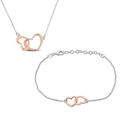 EVERLY JEWELRY | Two-Tone Silver Heart Charm Necklace and Bracelet Set -17.5 in + 8 in-Multiple Metal Color Option