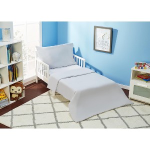 Everyday Kids 4-piece toddler bedding set is a perfect match for your toddler's room. Soft fabrics and solid color fits most rooms, these toddler bedding sets are ideal for any toddler's room. The set includes: one comforter, one top flat sheet, one fitted bottom sheet plus a standard size pillowcase. Comforter Measures 57" by 42", Flat Sheet Measures 60" by 45", Fitted Sheet Measures 52" by 28", Pillowcase Measures 30" by 20", fits all standard size crib mattresses (28" x 52".). Machine wash separately in cold water with like colors, gentle cycle, use only non-chlorine bleach when needed. Tumble dry low for best results, iron on low heat when needed.