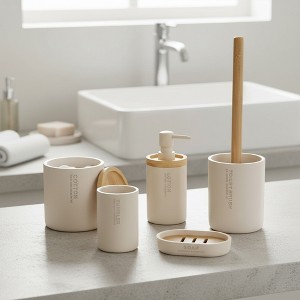 - HIGH QUALITY: Made from durable polyresin, each element of this bathroom accessory set combines functional strength with a sophisticated matte beige finish and bamboo accents