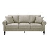 Inviting a traditional style that pairs to perfection with the contemporary color and softness of this chenille 3 seat sofa. In plenty of dimensionality, the sofa boasts familiar rolled arms and turned legs for elevated style. This Eco friendly frame is constructed from strong rubberwood, a tropical, solid wood taken from rubber plantations.