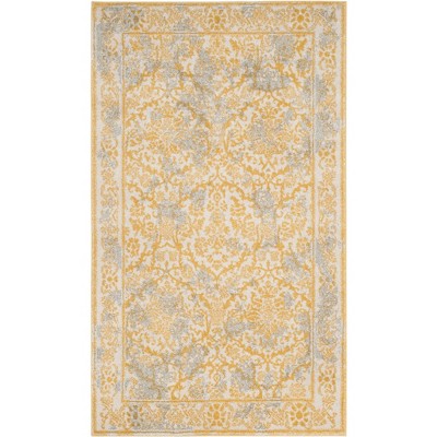 Delicately designed in a harmonious ivory and gold color palette, the rug features an intricate pattern that effortlessly blends traditional charm with a modern aesthetic. The detailed motifs and border encapsulate timeless beauty while adding a luxurious and warm ambiance to any room.