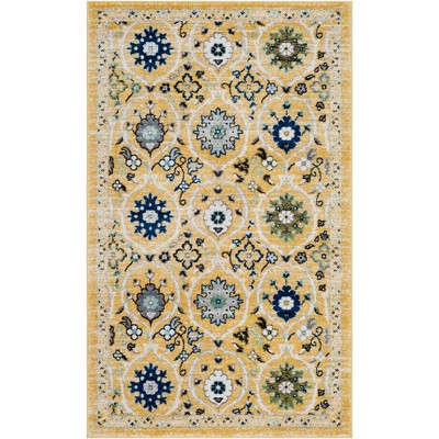 The rug features an intricate pattern that invokes a sense of grandeur and sophistication, with rich gold and ivory hues harmoniously intertwined and accentuated by pops of blue tones. The design exudes a classic elegance that is sure to complement any room's decor while providing a soft underfoot experience.