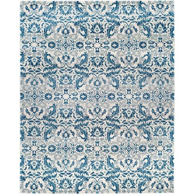 Introducing our exquisite 9' X 12' large rectangle area rug, a perfect blend of tradition and modernity. This stunning navy and ivory masterpiece is power-loomed with meticulous care and precision, ensuring an incredibly detailed and enduring design.