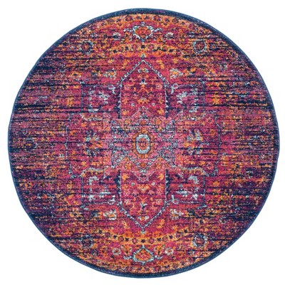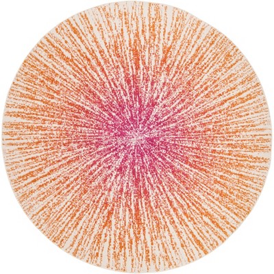 Introducing our exquisite 3' x 3' Round area rug, a statement piece that brilliantly captures the vibrant essence of Fuchsia and Orange hues. This round-shaped treasure is a product of intricate Power Loomed craftsmanship made in the majestic land of Turkey.