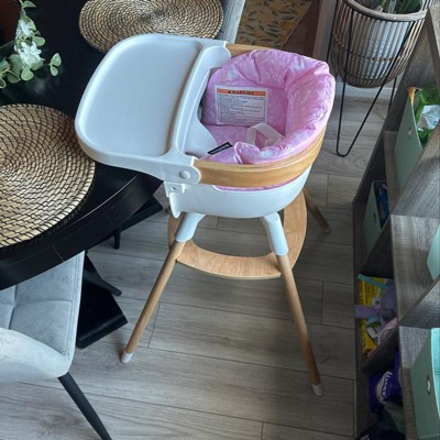 The high chair looks nice but is not very functional. The insert on it holds the straps which is a problem if you don’t do laundry 3x a day as infants are messy. In addition, this is a huge safety issue when the baby begins to try to stand. The table on it also can’t be adjusted so there is a lot of room between by infant and the table. Overall I don’t find this product safe or functional.