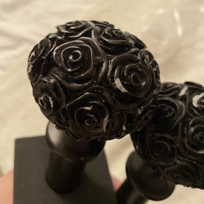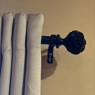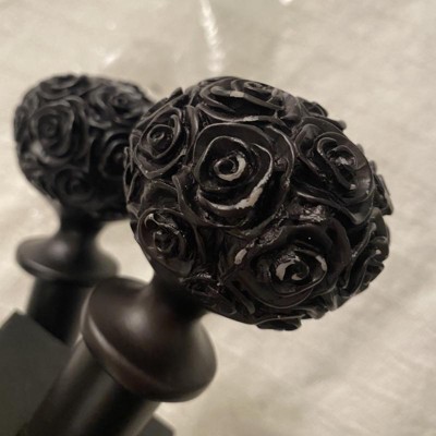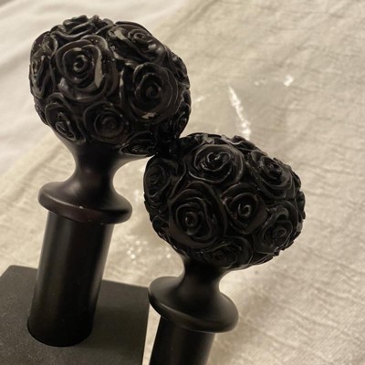 - The Peony matte black curtain rod and finial set features a romantic style and floral design with carved look peony resin sphere shape finials