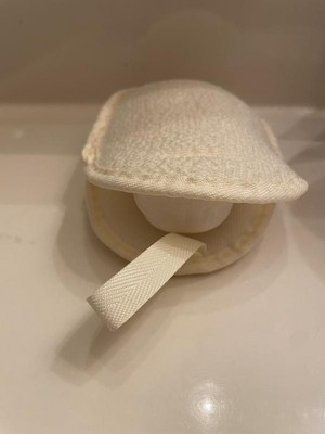This soap saver is a two in one deal. Not only does it store your soap but it also works like a loofah scrub when using. It lathers well and provides a light exfoliation. A homemade bar of soap fits well and is held secure with the thread through strap. The strap can also easily fit over a shower handle to hang in between uses.