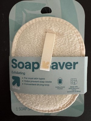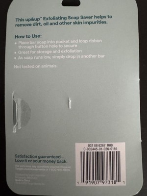Help prevent soap wastage with this Exfoliating Soap Saver Scrub from up&up™. Made with 100% recycled polyester and foam filling, this oval-shaped soap saver features an antibacterial pocket to hold the soap bar and a raised surface for extra exfoliation. It helps spread the lather for better cleansing, is designed to suit most skin types, and comes with a convenient loop for easy drying.