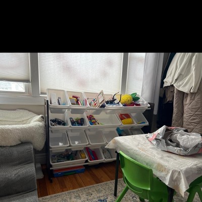 The 16 standard and 4 large colorful storage containers are BPA and phthalate free and easy to remove, replace and reposition along the 4 tiered shelves. These storage bins are sized just right within the toy organizer for toddlers and preschool aged children but are versatile enough for use by adults as well. This organizer is a great toy storage box alternative and the stylish espresso and white colorway makes it the perfect organizational solution for any room in the home. Made with sturdy engineered wood construction frame with stabilizing braces and steel shelving rods, each level can hold up to 20 pounds. Some assembly is required and all hardware is included.