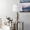 Illuminate your space with the stunning Ezra table lamp. Standing at 29 inches, this lamp brings elegance and style to any room. Crafted entirely from iron and finished in sleek nickel, its design harmonizes with both contemporary and classic decor.