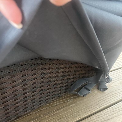 [This review was collected as part of a promotion.] This is a high quality product. I have other furniture covers on my porch; they are fine but are very thin and sometimes blow off the couch. This cover is thick and made of nice material. The almost black color is very pretty. Their are clip ties at the bottom (see photo) to secure it to the furniture and prevent issues in the wind. It comes with a 2-3 year reduced limited warranty. I received an incentive to write this review.