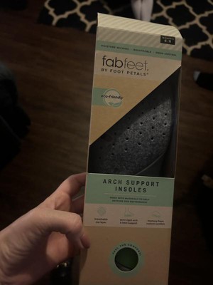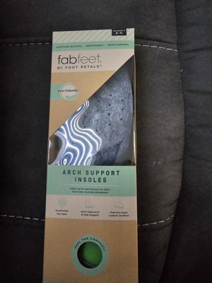 The Fab Feet Women’s by Foot Petals Insoles Cushions-Gray are arch support insoles. They are made with materials to help restore our environment. They have a breathable top layer, semi rigid arch and heel support and a soft memory foam custom comfort layer. They need to be trimmed to fit the shoes it’s super easy. Remove existing insoles from shoe. Use original insole as a guide and trim Arch Support to desired fit. Replace original insole with Arch Support Insoles. The Bloom memory foam conforms to foot. The perforated layer is excellent for increased airflow. The Bloom semi rigid arch support relieves pressure, soft spot heel strike absorbs impact. The deep heel cup increases stability. They can be put in most any shoe that needs more support.