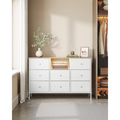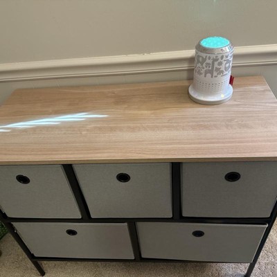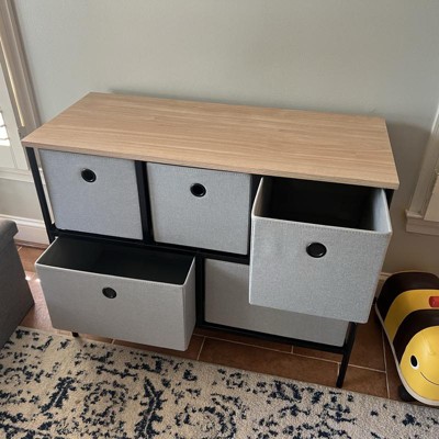 Keep your clothing, linens and other essentials organized out of sight with the Fabric Bin Dresser from Room Essentials™. This black dresser is designed in a horizontal alignment with a black metal frame and a natural wood-like top. It comes with fabric bins to help you stash away clothes, towels and more, and the built-in holes make it easy to pull the bins out.