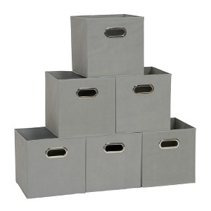 Offered in a pack of 6, these fabric storage bins are full of storage potential and can be used in any room of your home. The simple yet chic design can pair well with any pre-existing style and will help you cut down on clutter. The storage bins are made with sturdy fiberboard sides, lined with a durable gray fabric. Each bin easily slides in and out of shelving with a pull of the contrasting silver grommet handle. To save on space while not in use, these bins can be folded for compact self-storage or stacked to maximize space while in use. These storage bins have a classic look that can be a great addition to any room. The bins can be used in most standard-sized cubby-like shelving for a closed storage option. They can hold books, art supplies or excess clutter on bookshelves or closet shelves. The storage potential of these bins is limited only by your imagination. This pack of 6 gray storage bins is one of the essentials to an organized and tidy home. Their versatility makes them a classic storage option. These bins can also be easily cleaned with a damp cloth. Whether you live in an apartment, condo, dormitory or house, you’re sure to benefit from the use of these fabric storage bins.