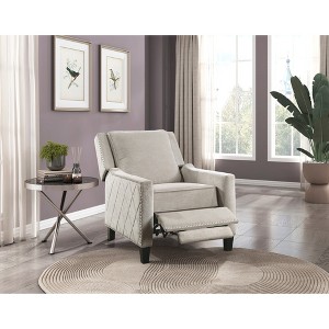 Relax in modern comfort with the Banks Collection push-back recliner chair. Designed with a sturdy solid wood and plywood frame reinforced with metal, this recliner offers durability and long-lasting support. Upholstered in gray textured fabric with a versatile neutral hue, it blends seamlessly with any d¨¦cor. The push-back reclining mechanism allows you to lounge with ease, while the nailhead trim and exposed black wood feet add a touch of classic elegance.