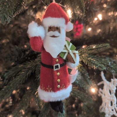 [This review was collected as part of a promotion.] This cute Santa ornament is made of felt! Great for my house because it isnt breakable and i have 5 kids and 7 cats! I love his facial expression and olive complexion. This ornament looks hadmade which goes well with my other ornaments. I also like how his arm is up like he is waving at you. The details on his coat are beautiful including the belt and buttons. He also is holding a green wrapped gift! I received an incentive to write this review.