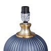- This lamp for accent tables features a blue drum shade, blue round body with ribbed pattern, and gold round metal base