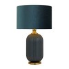 A blue table lamp that brings charm and elegant appeal to any room for an instant decor upgrade. This eye catching lamp makes a playful addition to your surface space and beautifully illuminate its surrounding area. Make a statement with this unique lamp on mantle, console table or in any living space. Designed with rubber stoppers at the base that prevent sliding around as well as scratching the floor. This item comes shipped in one carton. The shade of this table lamp is securely mounted on the body and circular base. Suitable for indoor use only. This accent piece features a blue velvet drum-shaped lampshade. Comes with an On/Off switch. Transitional Style.