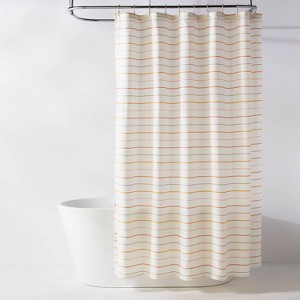 Enhance the visual appeal of your bath space with this Fabric Thin Striped Shower Curtain from Room Essentials™. Showcasing thin stripes in rust, orange, gray and pink hues on a white background, this decorative shower curtain lends cheerful flair to your bathroom decor. Made of 100% recycled polyester, this printed shower curtain features a buttonhole top for quick installation, while the machine-washable design allows for easy cleaning when needed.