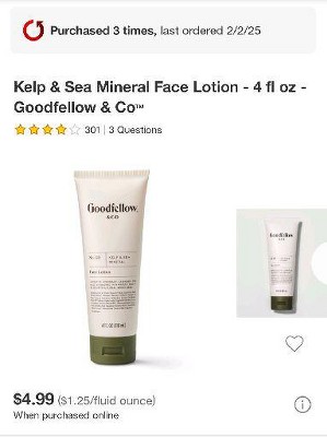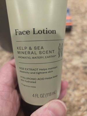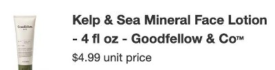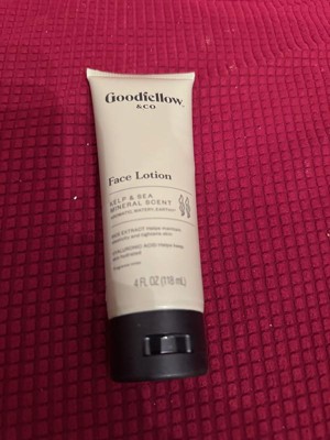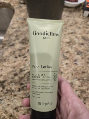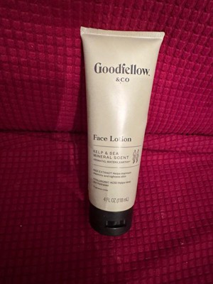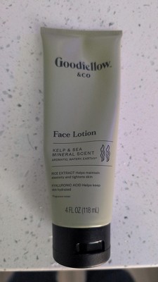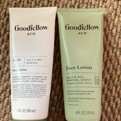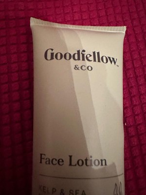 Reviewing Goodfellow & company kelp and sea mineral scent 4oz face lotion. I have been using a small pea size amount of this facial lotion at night for over two weeks after washing my face. The lotion leaves my skin feeling soft.