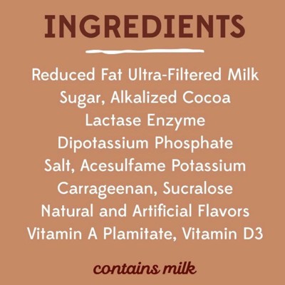 reduced fat ultra-filtered milk, sugar, alkalized cocoa, lactase enzyme, dipotassium phosphate, salt, acesulfame potassium, carrageenan, natural and artificial flavors, sucralose, vitamin a palmitate, vitamin d3' '