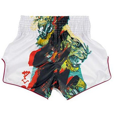 - These shorts feature a slim-cut Muay Thai design with intricate embroidery and detailing.