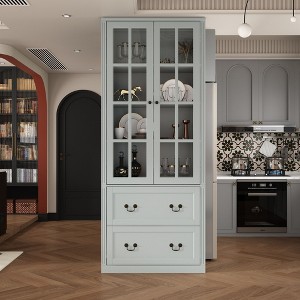 The upper part of the cabinet features two glass - paneled doors with a grid - pattern design. This not only allows you to showcase items such as dishes, jars, and decorative pieces but also protects them from dust. The glass doors are equipped with antique - brass - colored round knobs, adding a touch of elegance and facilitating easy opening and closing.