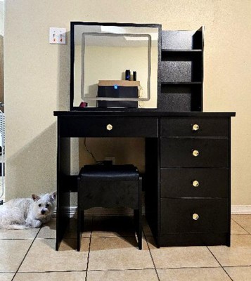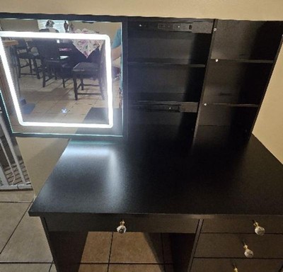 Beautiful vanity, I love the sliding mirror & the spacious drawers and aGood price. What I dislike is assembly, instructions were somewhat confusing but not too much, just a lot of screwing nails, be smarter than me and make sure you have a drill because the handheld screwdriver made this take forever. I spent about 6 hour in total putting it together. The stool also isn’t the greatest but I was planning on purchasing a desk chair either way. Another thing I’d like to add is the coating of the vanity cracked or chipped off when screwing in the screws. Good thing I got a black one so some sharpie will do the trick. Overall it’s not bad for the price.