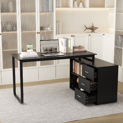 The desk has an L - shaped layout, with each main section measuring 63 inches in length. The left - hand side of the desk has an open shelving unit, which is 19.7 inches in width, 7.9 inches in depth, and has two compartments with a height of 8.7 inches each. This is great for storing books, files, or decorative items within easy reach.