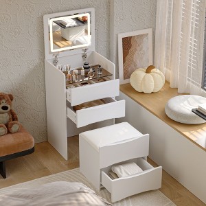Elevate your bedroom with this multifunctional white vanity. It features an LED mirror with warm, natural, and cool light modes, multiple drawers (with the top drawer having handy square compartments) for organized storage, and a movable stool. The vanity seamlessly transforms into a nightstand, computer desk, or study desk, adapting to your needs. The crisp white finish blends with various decor styles, making it a practical and stylish addition to organize cosmetics, work essentials, or bedside items.