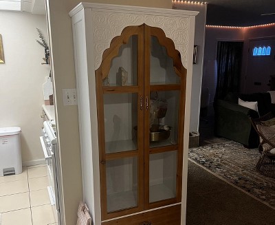 Bring the charm of French Country style into your home with this White Wood Display Cabinet with Glass Doors and Drawer. Crafted from premium wood, this cabinet combines aesthetic appeal with practical storage. The pristine white finish contrasts beautifully with natural wood accents on the glass door frames and drawer front, creating a warm and sophisticated ambiance. Inside, three shelves provide flexible display space for your collectibles, books, or decorative items. The bottom drawer, fitted with a classic metal handle, offers additional storage for smaller accessories. With its scalloped top and curved legs, this cabinet adds a touch of elegance to any living room, dining area, or entryway, serving as a functional yet stylish centerpiece for your home decor