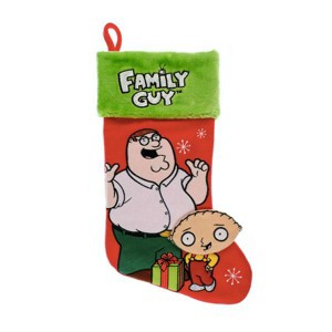 Decorate your home with this beautiful Christmas stocking featuring Stewie and Peter Griffin from Family Guy. Beautiful applique and embroidered materials in bright vibrant colors. A must have for Family Guy fans. Stocking is made of polyester. 20" size is perfect for stuffing with lots of small stuffers. High quality materials and construction.