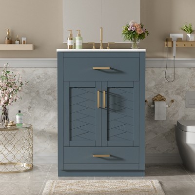 Product Name: FAMYYT 30 in. Single Sink Freestanding Indigo Bath Vanity with White Ceramic Top, 3 Drawers and Soft Closing Doors