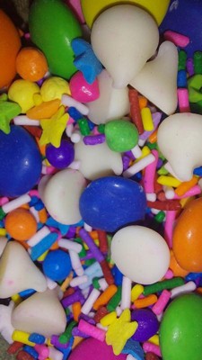 [This review was collected as part of a promotion.] This is a fun mixture of sprinkles, white chocolate chips, and m&m type candies. I used these instead of m&ms in my cookie recipe and they turned out good. I'm not a fan of the ingredients of these since I try to avoid artificial colors. I think these would look good on a cake or cupcakes.