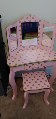 [This review was collected as part of a promotion.] This is such a cute vanity set with its polka dot design! Made of sturdy wood. The stool is rated to hold 100 lbs. It has real mirrors! It even has a little drawer to put all your stuff in. My 8 year old loves it!
