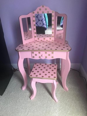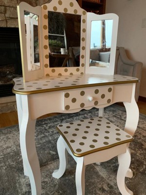 [This review was collected as part of a promotion.] I got this vanity for my kid to have a space for activities and what-not in their room. It is pretty easy to assemble, the instructions were clear and concise. I really like the design on it though, the gold polka dots are pretty great. It seems very stable and durable, like its going to last for years to come. My kid loves as they use for a multitude of activities. Highly recommend!