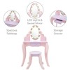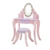 Fantasy Fields' Little Princess Rapunzel Vanity Playset includes a durable table with an acrylic oval mirror, surrounded by LED lights. This pink and lavender set includes a stool, a storage drawer, and bins on the tabletop for personal items.