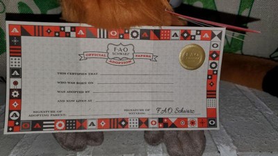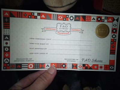 [This review was collected as part of a promotion.] I was gifted for free this completely adorable Toy Plush Baby Monkey- Chimpanzee 12-in Black and Tan in exchange for my honest review. I am completely in love with this little Chimpanzee! He is so extremely soft, touchable and completely adorable. He came with adoption papers and an information card "Adopt-A-Wild". The information about where he's from and about chimpanzees were inside the card. He also came with an official FAO SCHWARTZ adoption papers to be filled out all completely official looking and a little tiny size. I absolutely adore him.