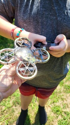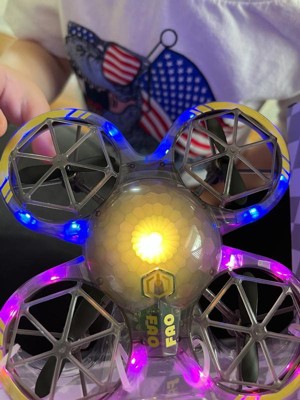 [This review was collected as part of a promotion.] Cute toy, easy to set up and play with but doesn't keep kids attention for very long. Lights are fun and bright - good for both day and night time use. Handheld remote needs batteries as well as drone. Don't forget to turn them off or you'll burn out your batteries! It is a bit noisy so you can definitely hear this thing coming. Easy to use and good for early learners.
