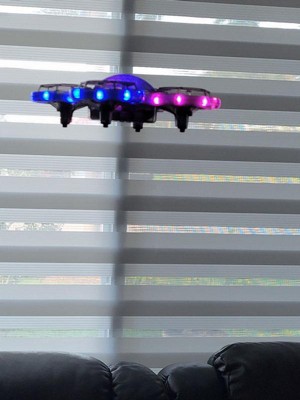 [This review was collected as part of a promotion.] This drone is so much fun. My kids love how bright the lights are and how it changes colors as it’s flying. I like the padded feet so it isn’t scratching surfaces when it lands. The size is great big enough to see easily while it’s flying around but not bulky and heavy.