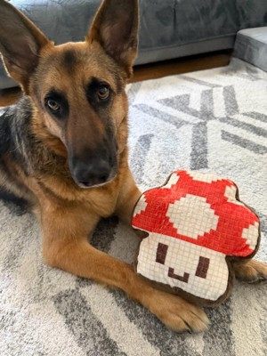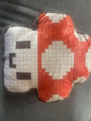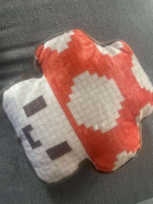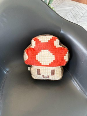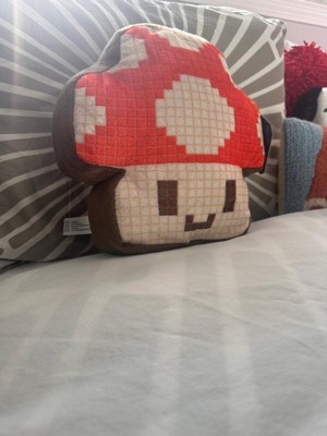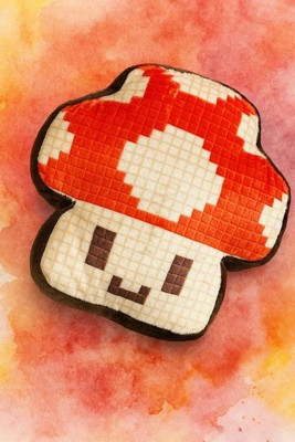 - Soft 10” plush shaped like a classic pixelated power-up mushroom