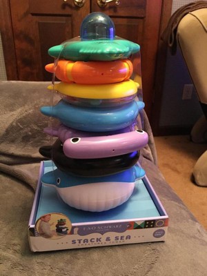 [This review was collected as part of a promotion.] This FAO Schwarz - Toy Stack Tower Sea Creatures is reall cute and keeps a baby entertained and engaged for a long time. It also reiforces a lot of fine and gross motor skills stacing the creatures up on the post. All the rings represent a different sea creature and have a different size and shape and one of the rings is also a rattle. They have lots of different surfaces and angles for a child to grasp and explore. The rings are bright colors a baby will love. This toy made a perfect baby shower gift because its safe for new borns on up for lots of playtime. The plastic is very easy to wash and keep clean which is a definite plus!