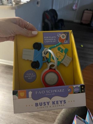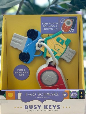 Introduce your little one to their very first set of keys with the F.A.O. Schwarz® Busy Keys with Lights & Sounds. Designed to entertain and engage, this fun toy set features a key fob that lights up and plays a variety of sounds, mimicking real car keys in a completely child-safe way. The set includes two robust keys attached to a durable key ring, all sized perfectly for small hands. The large buttons on the fob are easy for little fingers to press, helping to develop motor skills while they play. Suitable for infants aged 10 months and up, these Busy Keys provide sensory stimulation and fine motor skill development, making them an excellent gift for your developing child.