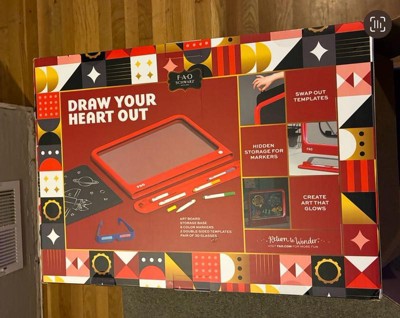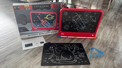 Create glowing masterpieces with the FAO Schwarz® Ultimate Neon Light Board 11-Piece Set. This vibrant drawing board features 12 LED light modes to bring your art to life and includes 6 erasable markers so you can draw, erase, and repeat. Slide in a template, use it as a background, or draw freehand right on the surface. Put on the included 3D glasses to make your neon designs jump off the screen. Everything stores neatly in the base, which also doubles as a stand to display your latest work. With adjustable lighting, reusable surfaces, and colorful tools, this light board makes creativity shine.
