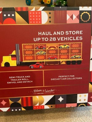 [This review was collected as part of a promotion.] Such a cool toy ! My 7 years old loves it !!! It is a great toy for those who loves diecast cars !!! This semi-truck can hold up to 28 vehicles ! Must have for age 5 and up !!! You don't even need to assembly much ! This toy is build to last !