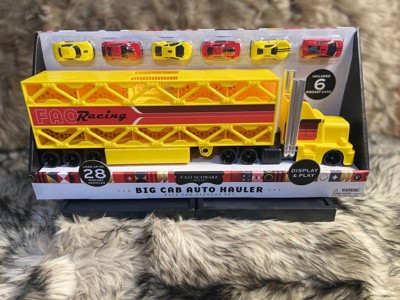 Transport your diecast car collection in style with the FAO Schwarz® Big Cab Auto Hauler Race Car Storage Set. This impressive set includes a realistic semi-truck and auto hauler trailer that rolls, swivels, and detaches for dynamic play. The spacious 1:16 scale trailer can haul and store up to 28 vehicles, making it ideal for avid diecast car collectors. Included in the set are six diecast race cars, ready to hit the road. The trailer measures 15.5” x 5.75”, with individual car spaces measuring 3” x 1.5” x 1.5”, perfectly sized for your favorite diecast models. Whether displaying your collection or transporting cars to the next race, this hauler set combines functionality with fun, making it a must-have for any car enthusiast.