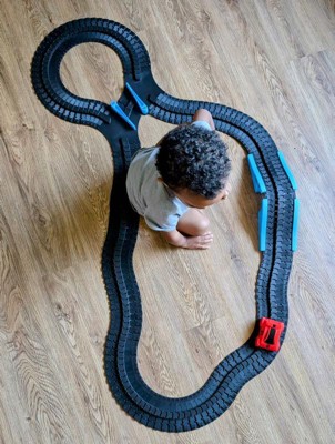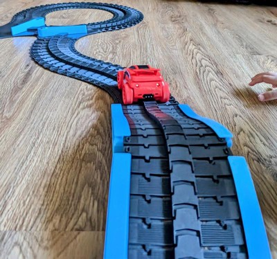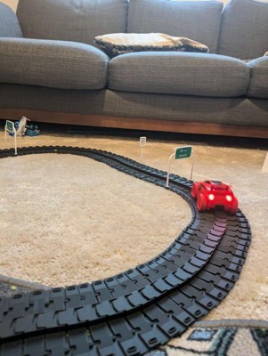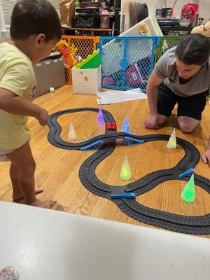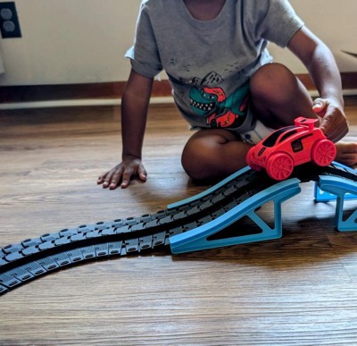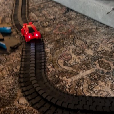 [This review was collected as part of a promotion.] This race car and track is a hit with my 3 year old. The flexible track is endlessly customizable with loops and sharp turns. The accompanying car stays on the track and climbs grade with ease. The headlights and tail lights are a fun touch that my toddler loves. The tracks are a little difficult for my 3 year old to put together by himself but operates the car with ease.